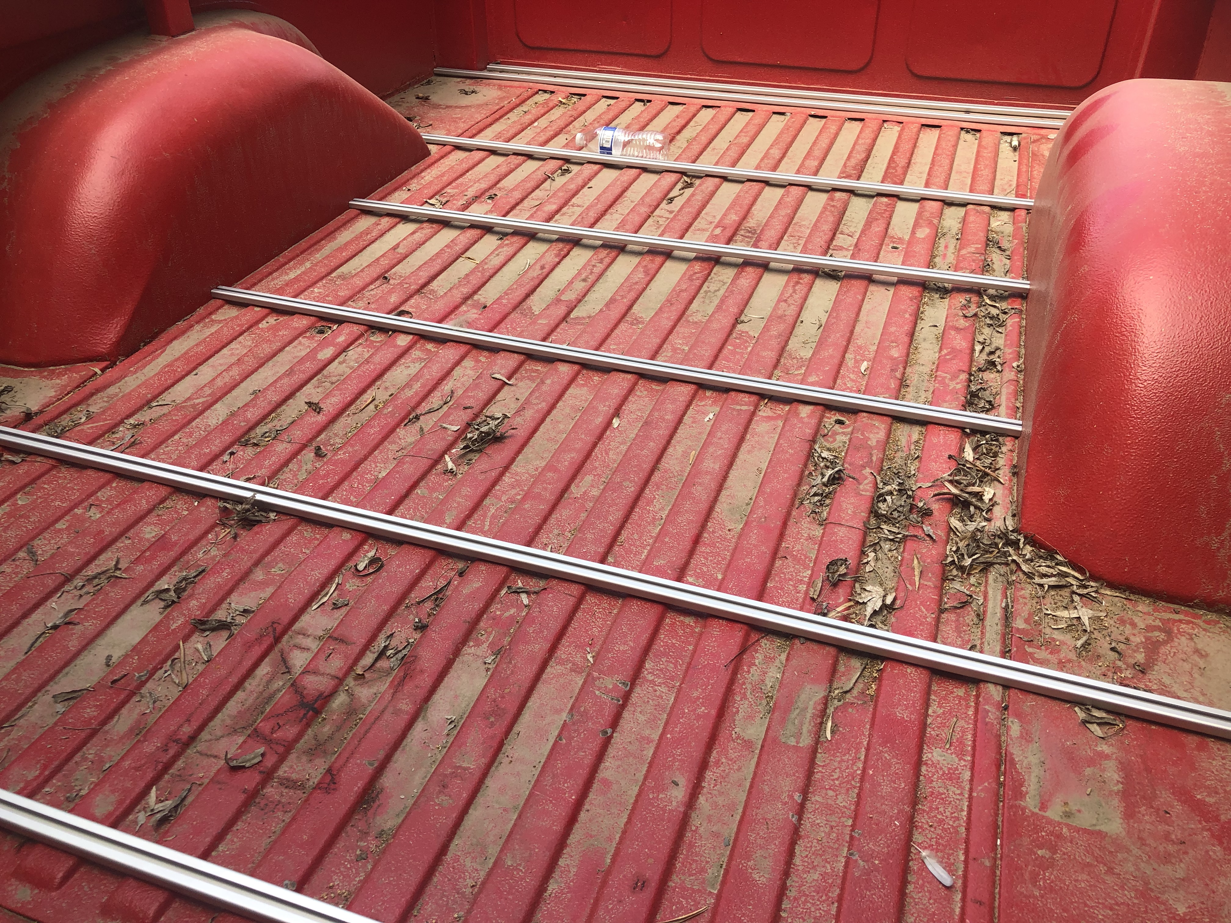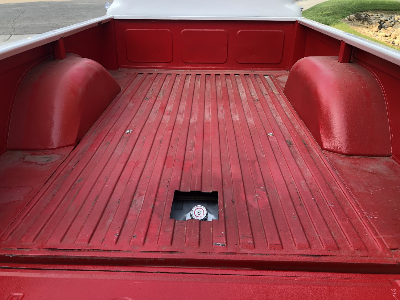 Dealing with the ugly bed became a top priority for me. Each time I went out to cut the hole for the fuel fill access I would literally get bummed at the ugly sight of the bed floor and then walk away. Three years ago when we put the red bed liner spray on it looked good 'nuff but apparently the rust treatment was not washed off enough and the liner has begun to bubble off. The only consolation prize is that there is no visible rust present so although the red liner is coming off, the undercoating is still keeping the rust at bay.