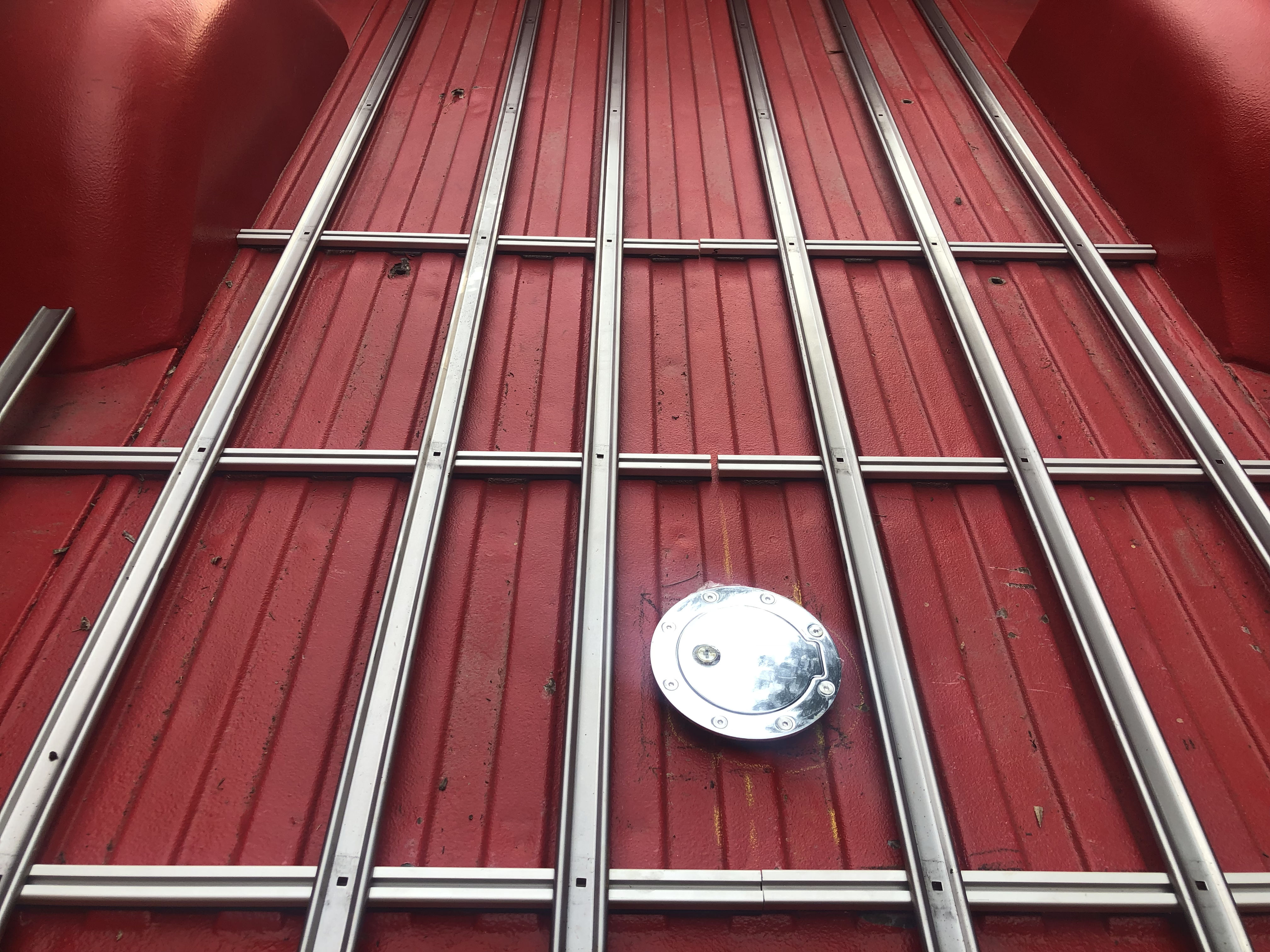 The next item was to locate the exact position of the hole in the bed for the fuel filler cap which will be mounted on the center board. I bumped the width of the center board up to 1x10 to accommodate the fuel door I selected keeping in mind that the fill spout on the '69 Mustang is off center and to the right (passenger) side. You can see this by looking at the square I cut into the bed. Although the square hole is centered, the fill is to the right. the 1x10 was wide enough to account for this and not run into issues with the steel bed strips.